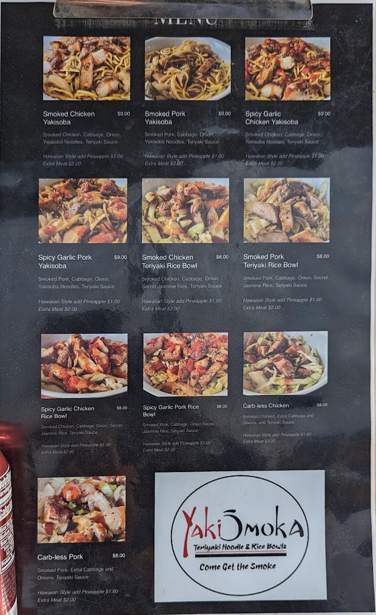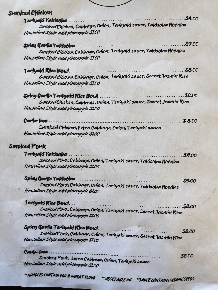 Smoked chicken, cabbage, onion, yakisoba noodles, teriyaki sauce. Hawaiian Style, add pineapple for an additional charge. Extra meat for an extra cost.